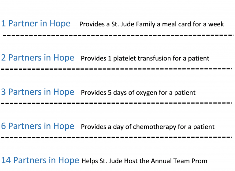 Families never receive a bill from St. Jude for treatment, travel, housing, or food – because all a family should worry about is helping their child live. Become a Partner in Hope today for just $19 a month. Your generous donations can provide the following for a child at St. Jude Children’s Research Hospital: